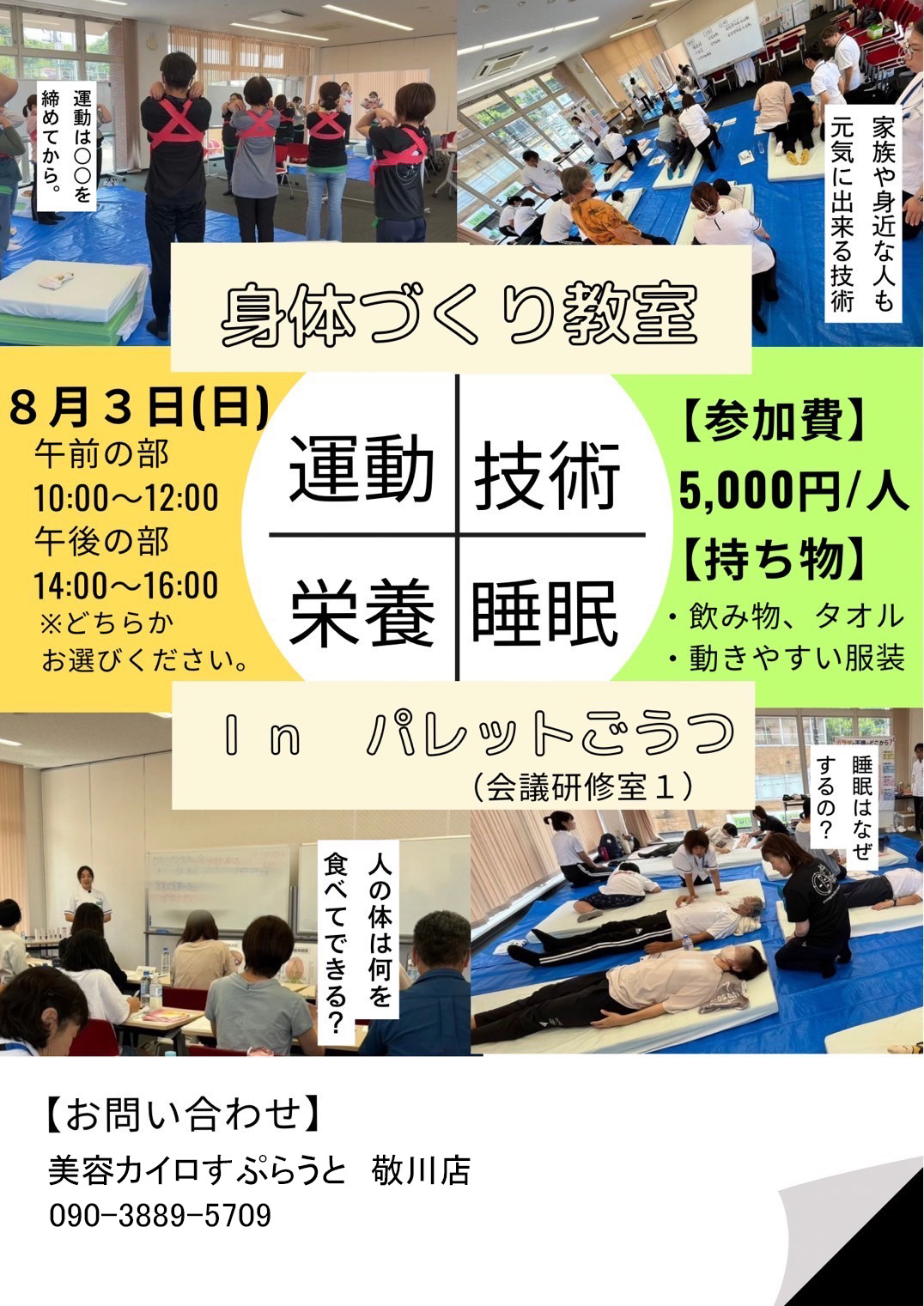 8/3㈰、パレット江津にて「身体づくり教室」を午前の部は10:00~12:00、午後の部は14:00~16:00に行いますぜひご参加ください!! お問い合わせ美容カイロすぷらうと 敬川店:090-3889-5709
