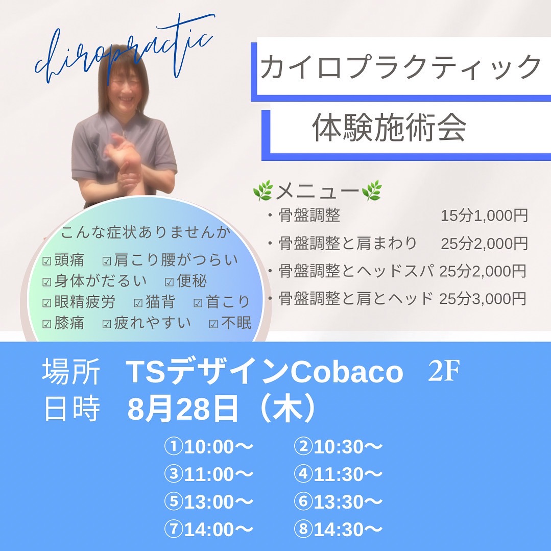 8/28㈰、浜田市のTSデザインCobacoさんにて「カイロプラクティック体験施術会」を行いますぜひご参加ください!! お問い合わせ美容カイロすぷらうと 敬川店:090-3889-5709
