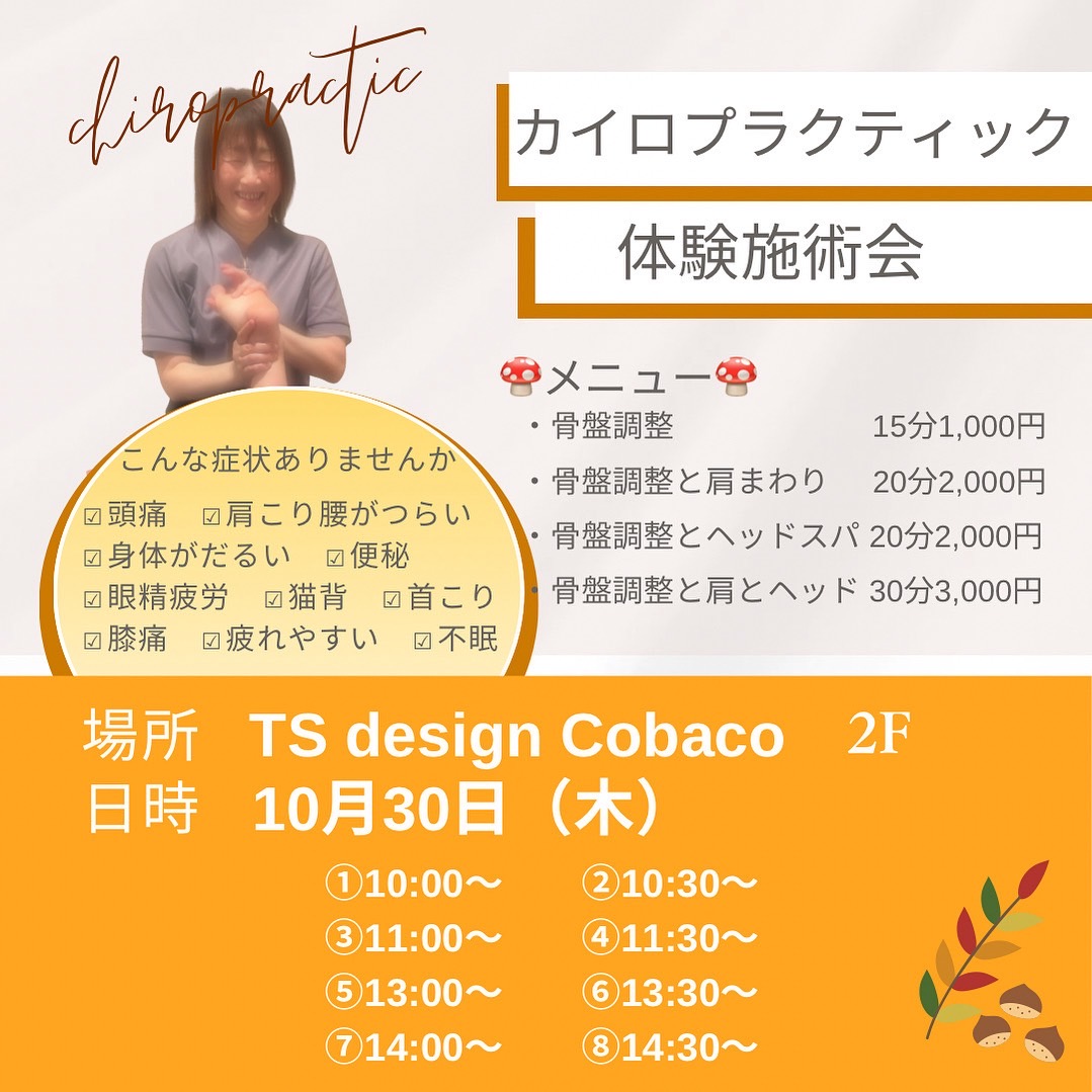 10/30㈭、浜田市のTSデザインCobacoさんにて「カイロプラクティック体験施術会」を行いますぜひご参加ください!! お問い合わせ美容カイロすぷらうと 敬川店:090-3889-5709