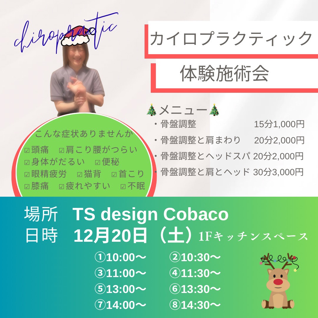 12/20㈯、浜田市のTSデザインCobacoさんにて「カイロプラクティック体験施術会」を行いますぜひご参加ください!! お問い合わせ美容カイロすぷらうと 敬川店:090-3889-5709