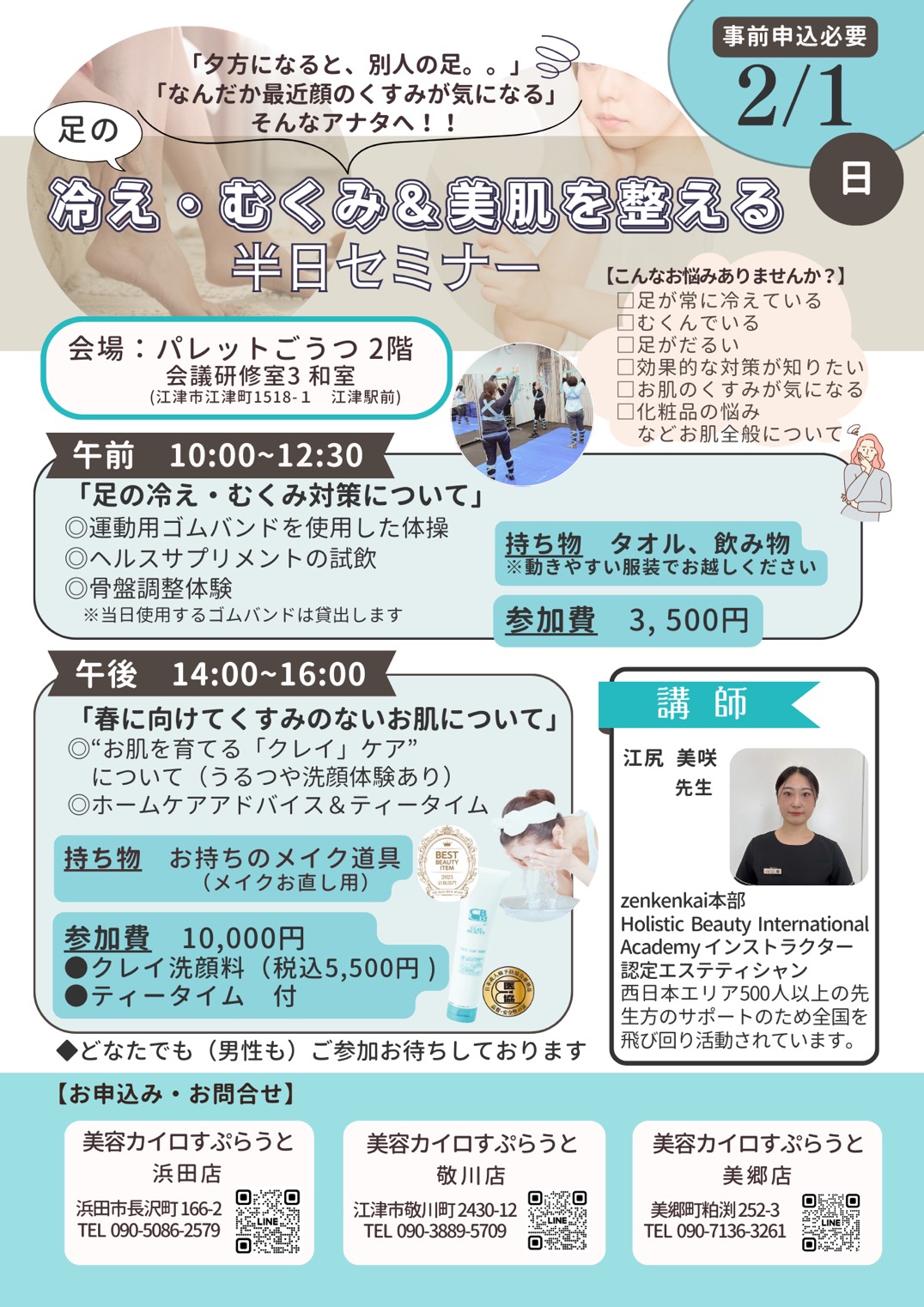 2/1(日)、江津市のパレットごうつにて「足の冷え・むくみ&美肌を整える半日セミナー」を行います気になる方はお気軽にご連絡ください♪ お申込み・お問い合わせ美容カイロすぷらうと 敬川店:090-3889-5709