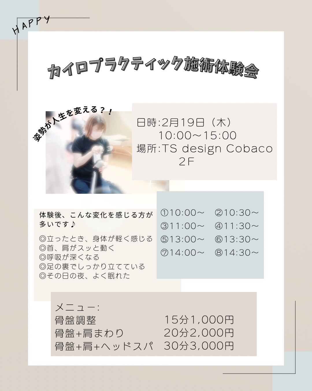 2/19(木)、浜田市のTSデザインCobacoさんにて「カイロプラクティック施術体験会」を行いますぜひご参加ください!! お問い合わせ美容カイロすぷらうと 敬川店:090-3889-5709