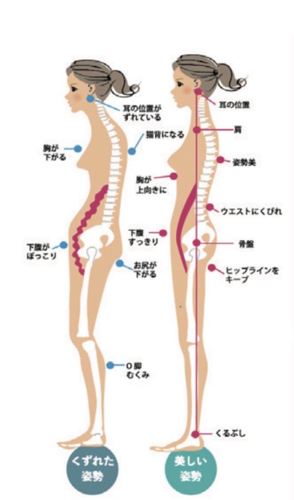 姿勢がくずれてしまうと、猫背など見た目がよくない、だけではなく、 身体にも不調が出てきます。例えば腰痛、肩こり頭痛、などです。